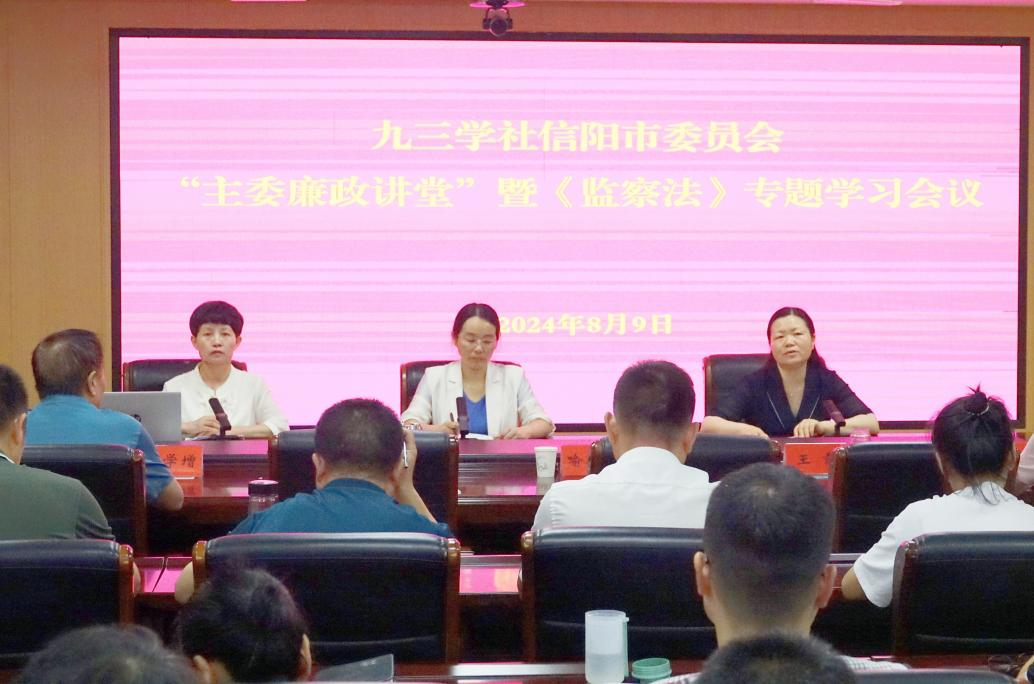8月9日,九三学社信阳市委“主委廉政讲堂”暨《监察法》专题学习会议召开。九三学社信阳市委主委、信阳农林学院中心实验室主任喻艳红作廉政授课。社市委副主委李华、王霞,秘书长向仕艳,社市委委员、内部监督委员会委员、各支社离任主委和新领导班子成员、专委会主任和机关干部参加会议。会议由李华主持。