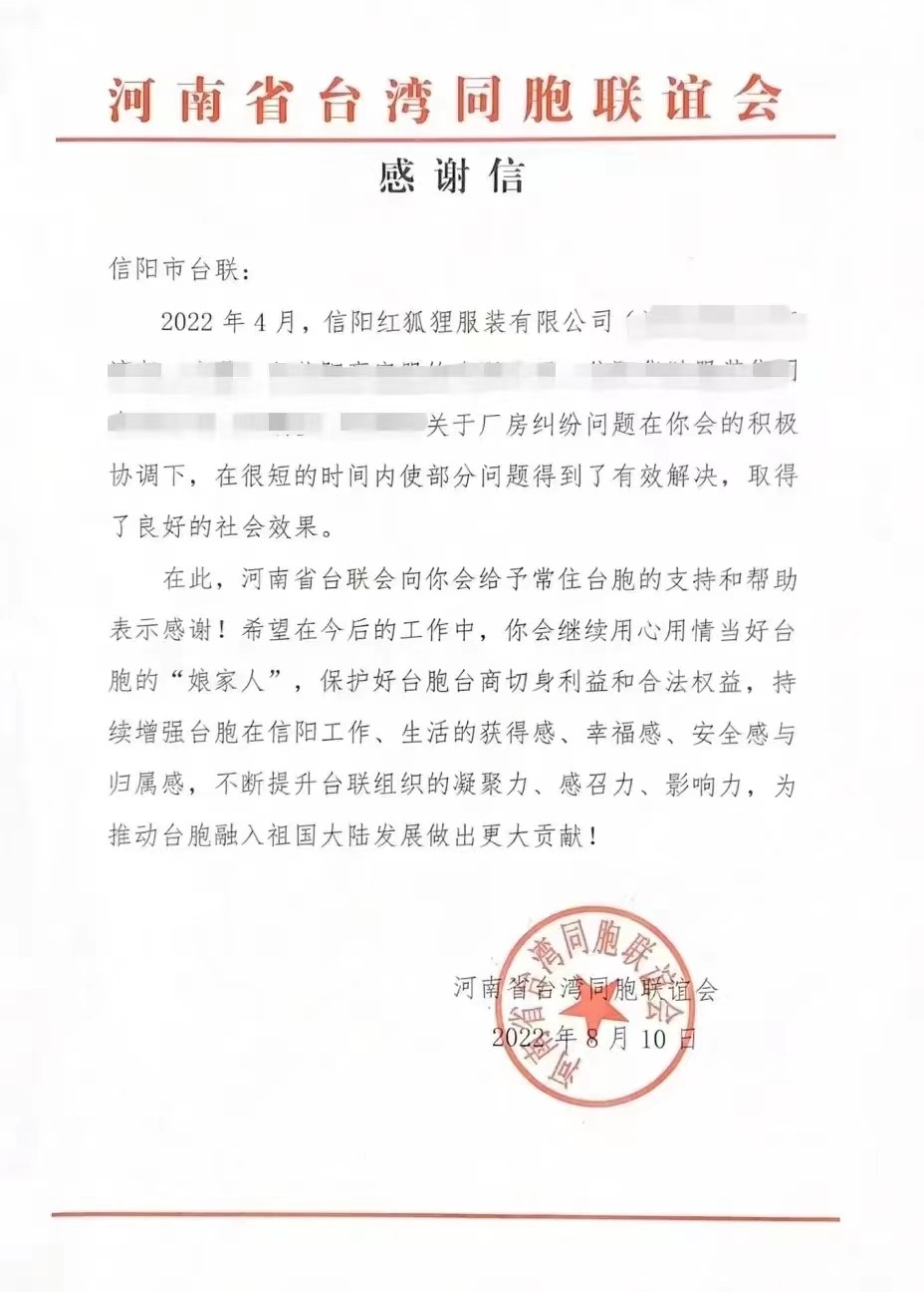 一衣带水,两岸情深。今年4月,台资企业信阳红狐狸服装有限公司求助,希望帮助协调解决厂房纠纷问题。针对台企反映的诉求,市台联、平桥区委统战部迅速联系有关单位,经过实地走访、多方协商,台资企业所提诉求得到有效解决。为此,河南省台湾同胞联谊会对信阳市统战工作表示真挚的感谢,对市台联积极化解在信台企困难的做法给予充分肯定,并希望继续用心用情当好台胞的“娘家人”。