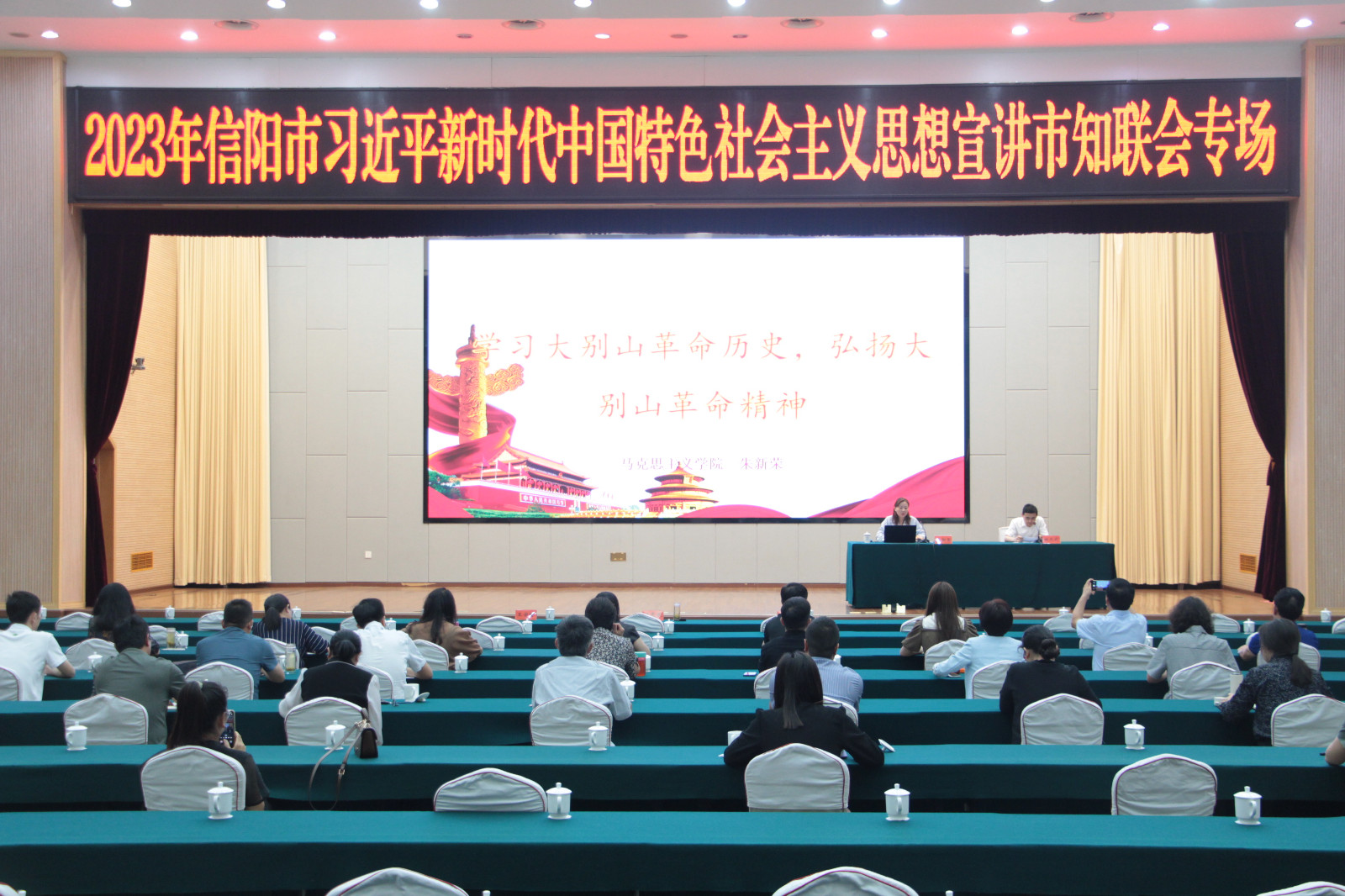 信阳学院马克思主义学院副院长、副教授朱新荣以《学习大别山历史 弘扬大别山精神》为题,从大别山革命精神的孕育形成、革命历史、革命精神、时代启示等4个方面,详细讲述了大别山区军民在党的领导下,浴血奋战、前仆后继,创造“28年红旗不倒”的革命奇迹,深刻阐释了“坚守信念、胸怀全局、团结奋进、勇当前锋”的大别山精神内涵。