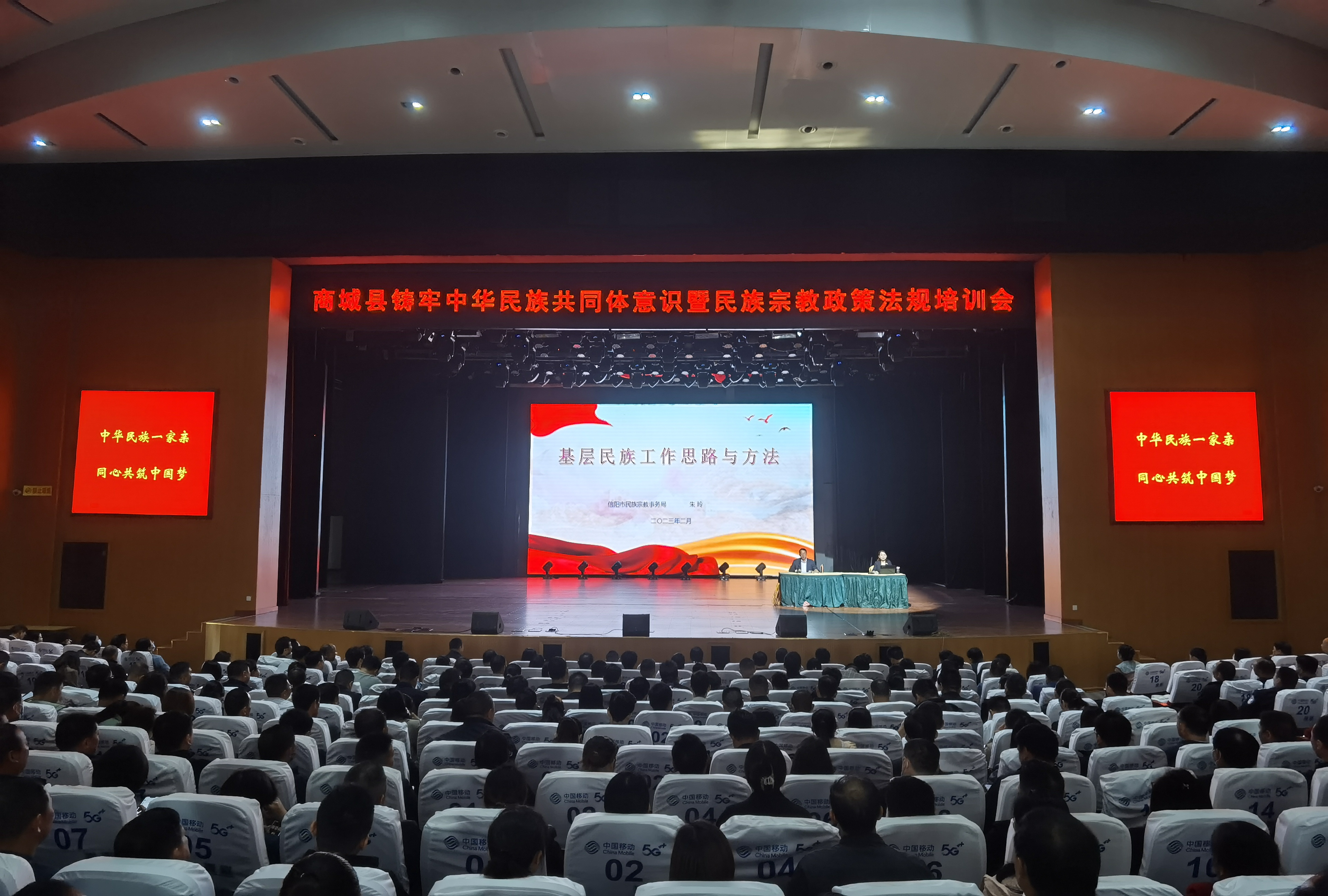 4月12日,商城县铸牢中华民族共同体意识暨民族宗教政策法规培训会在县影剧院举办。县委常委、统战部部长肖同建出席会议并讲话,县委统一战线工作领导小组和县民族宗教工作领导小组成员单位分管负责同志,各乡镇(处)党(工)委副书记、统战委员、宗教工作助理员、派出所负责人,各村(社区)宗教工作协理员共计510余人参加培训。